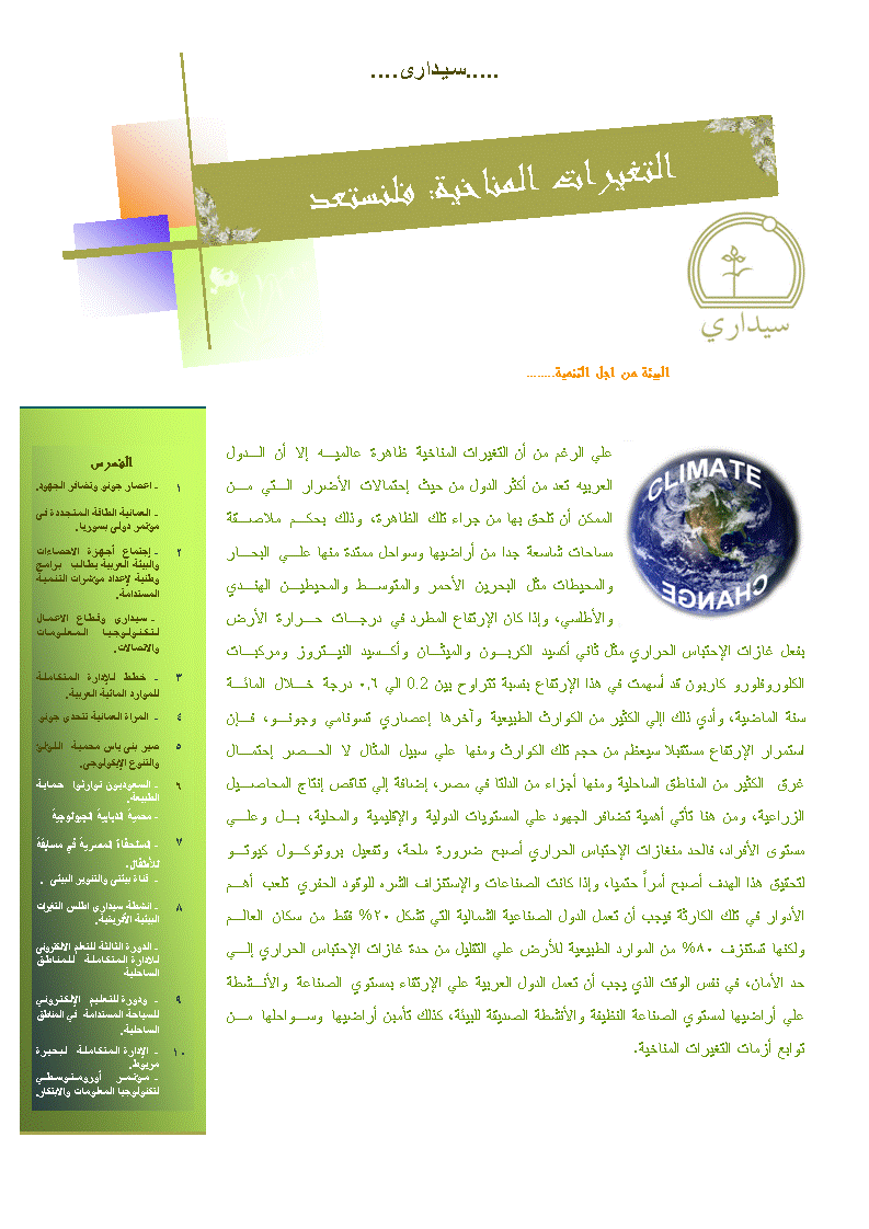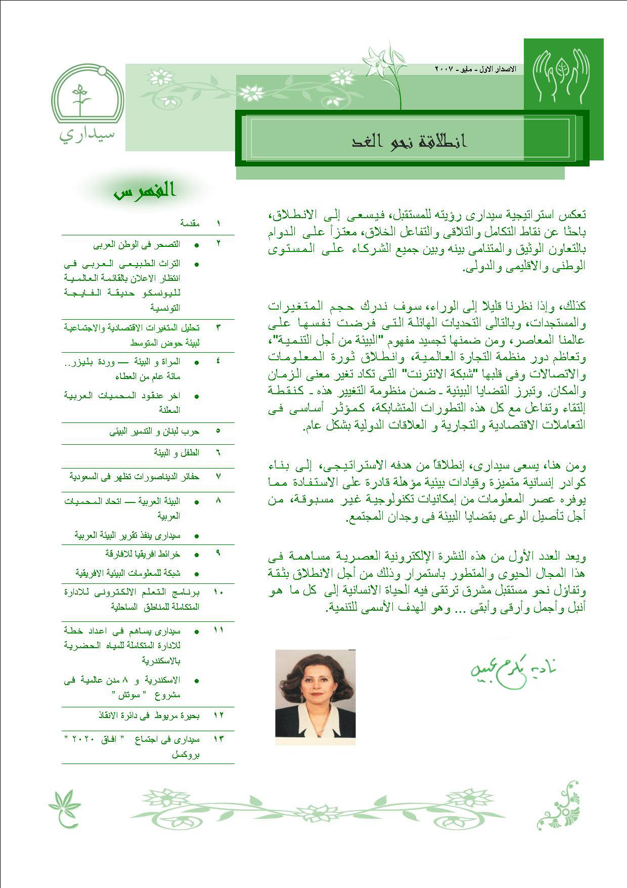1- مقدمة 2- التصحر فى الوطن العربى - التراث الطبيعى العربى فى انتظار الاعلان بالقائمة العالمية لليونسكو حديقة الفايجة التونسية 3- تحليل المتغيرات الاقتصادية والاجتماعية لبيئة حوض المتوسط 4- المراة و البيئة — وردة بليزر.. مائة عام من العطاء - اخر عنقود المحميات العربية المعلنة 5- حرب لبنان و التدمير البيئى 6- الطفل و البيئة 7- حفائر الديتاصورات تظهر فى السعودية 8- البيئة العربية — اتحاد المحميات العربية - سيدارى ينفذ تقرير البيئة العربية 9- خرائط افريقيا للافارقة - شبكة للمعلومات البيئية الافريقية 10- برنامج التعلم الالكترونى للادارة المتكاملة للمناطق الساحلية 11- سيدارى يساهم فى اعداد خطة للادارة المتكاملة للمياه الحضرية بالاسكندرية - الاسكندرية و8 مدن عالمية فى مشروع ” سوتش 12- بحيرة مريوط فى دائرة الانقاذ. 13- سيدارى فى اجتماع ” افاق 2020 ” بروكسل |